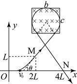 、方向垂直于纸面向外的矩形磁场区域,并最终从x轴上的N(4L,0)点与x轴正向成45°角离开第一象限,题中只有m、v0、q、L为已知量,求: