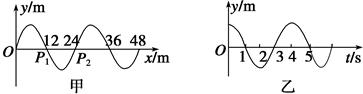 选择题 一列简谐波,从某时起当t=3 s时刻的波形如图甲所示,图乙为质点P1的振动图象,则由图可知A.该波向x轴正向传播B.该波的传播速度为6 m/sC.t=2 s时,质点P2处于正向最大位移处D.t=10 s时,质点 P2处于平衡位置处