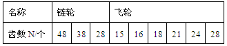 选择题 某种变速自行车有六个飞轮和三个链轮,链轮和飞轮的齿数如下表所示,前后轮直径为660mm,人骑该车行进速度为5m/s,脚踩踏板做匀速圆周 运动的最大角速度约为A.7.6 rad/sB.15.2rad/sC.24.2rad/sD.48.5rad/s