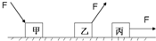 选择题 一物体置于粗糙水平地面上,按如图所示,在外力F的作用下运动,设地面与物体各接触面间的压力在外力F的作用下加速直线运动,设地面与物体与各触面的动摩擦因数相等,则木块受到的摩擦力的大小关系和获得的加速度大小关 系是A.f甲>f丙>f乙B.a甲<a丙<a乙C.f甲<f丙<f乙D.a甲>a丙>a乙