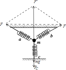 假设ab弹簧是拉力,假设c弹簧是拉力,弹簧a、b对质点的作用力大小均为F,两个力夹角是120°,所以合力大小为F,方向竖直向上,由平衡条件得:F=mg+Fc, 所以:Fc=F-mg