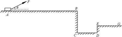 2、计算题 (18分)如图所示,一质量为m的物块在与水平方向成θ的力F的作用下从A点由静止开始沿水平直轨道运动,到B点后撤去力F, 物体飞出后越过“壕沟”落在平台EG段.已知物块的质量m =1kg,物块与水平直轨道间的动摩擦因数为μ=0.5,AB段长L=10m,BE的高度差h =0.8m,BE的水平距离 x =1.6m.若物块可看做质点,空气阻力不计,g取10m/s2.