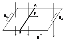 4、计算题 水平放置的光滑矩形金属框架,宽0.2米,长度较长,上面搁一不计电阻的直导线AB,质量m=0.5千克,框架电阻不计,两端各接一电阻R1=1Ω,R2=2Ω,磁场与框架平面垂直,向下B=1特,现用恒力F=0.3牛,水平拉AB导体,当到达某一位置时,R2的消耗功率为0.5瓦,,问:
