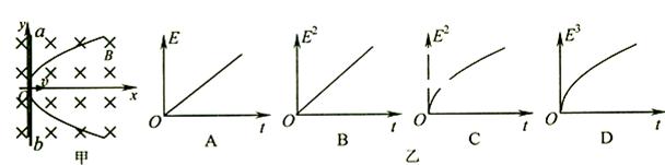 2、选择题 在xOy平面内有一条抛物线金属导轨,导轨的抛物线方程为y2=4x,磁感应强度为B的匀强磁场垂直于导轨平面向里,一根足够长的金属棒ab垂直于x轴从坐标原点开始,以恒定速度v沿x轴正方向运动,运动中始终与金属导轨保持良好接触形成闭合回路,如图甲所示。则图乙所示图象中能表示回路中感应电动势大小随时间变化的图象是(?)