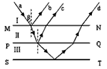 平面MN、PQ、ST为三个相互平行的界面,Ⅰ、Ⅱ、Ⅲ为三种不同的介质,平面ST的上表面涂有反射层(光线不能通过)。某种单色光线射向界面MN后,发生了一系列的反射和折射现象,光路如图所示。则( ? )
