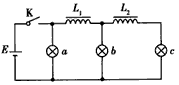 5、选择题 如图所示的电路中,三个相同的灯泡a、b、c和电感L1、L2与直流电源连接,电感的电阻忽略不计。开关K从闭合状态突然断开时,下列判断正确的是