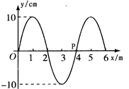 3、填空题 一列沿+x方向传播的简谐横波在t=0时刻刚好传到x=6m处,如图所示,已知波速v=10m/s,则图中P点开始振动的方向沿 (选填“+y”或“-y”)方向, 该点的振动方程为y= cm