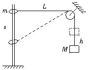 1、计算题 如图所示,光滑杆上套上质量为m的小环,由细绳经定滑轮与质量为M的重物相连,滑轮与环距离l=0.3 m,将环静止释放,下滑最大位移为0.4 m,求。