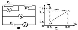 5、选择题 如图甲所示,在滑动变阻器的滑动触头P从一端滑到另一端的过程中,两块理想电压表的示数随电流表示数的变化情况如图乙所示,则滑动变阻器的最大阻值和定值电阻R0的值分别为