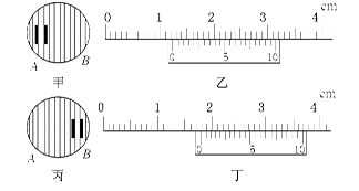 5、实验题 (4分)某同学在做“双缝干涉测定光的波长”实验时,第一次分划板中心刻度线对齐第2条亮纹的中心时(如下图甲中的A),游标卡尺的示数如下图乙所示,第二次分划板中心刻度线对齐第6条亮纹的中心时(如图丙中的B),游标卡尺的示数如图丁所示.已知双缝间距d="0.5" mm,双缝到屏的距离L="1" m.则所测光波的波长为______m(保留两位有效数字) .