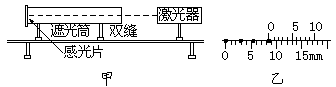 1、实验题 某同学设计了一个测定激光的波长的实验装置,如图甲所示。激光器发出的一束直径很小的红色激光进入一个一端装双缝、另一端装有感光片的遮光筒,感光片的位置上出现一排等距的亮点,图乙中的黑点代表亮点的中心位置。