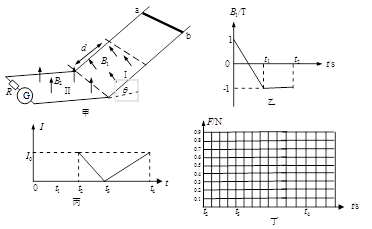 1、计算题 如图(甲)所示,两光滑导轨都由水平、倾斜两部分圆滑对接而成,相互平行放置,两导轨相距L=lm ,倾斜导轨与水平面成θ=30°角,倾斜导轨的下面部分处在一垂直斜面的匀强磁场区I中,I区中磁场的磁感应强度B1随时间变化的规律如图(乙)所示,图中t1、t2未知。水平导轨足够长,其左端接有理想的灵敏电流计G和定值电阻R=3Ω,水平导轨处在一竖直向上的匀强磁场区Ⅱ中,Ⅱ区中的磁场恒定不变,磁感应强度大小为B2=1T ,在t=0时刻,从斜轨上磁场I 区外某处垂直于导轨水平释放一金属棒ab,棒的质量m=0.1kg,电阻r=2Ω,棒下滑时与导轨保持良好接触,棒由斜轨滑向水平轨时无机械能损失,导轨的电阻不计。若棒在斜面上向下滑动的整个过程中,灵敏电流计G的示数大小保持不变,t2时刻进入水平轨道,立刻对棒施一平行于框架平面沿水平方向且与杆垂直的外力。(g取10m/s2)求: