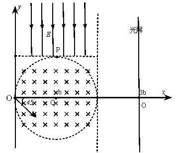 4、计算题 如图,半径为b、圆心为Q (b, 0) 点的圆形区域内有垂直纸面向里的匀强磁场,在第一象限内,虚线x=2b左侧与过圆形区域最高点P的切线y=b上方所围区域有竖直向下的匀强电场。其它的地方既无电场又无磁场。一带电粒子从原点O沿x轴正方向射入磁场,经磁场偏转后从P点离开磁场进入电场,经过一段时间后,最终打在放置于x=3b的光屏上。已知粒子质量为m、电荷量为q (q> 0), 磁感应强度大小为B, 电场强度大小,粒子重力忽略不计。求: