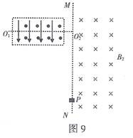 1、简答题 在如图 9 所示的装置中 , 虚线框内存在互相垂直的匀强磁场和匀强电场 , 匀强磁场方向 向下 , 磁感应强度为B1; 匀强电场方向垂直纸面向外 , 场强为 E 。在MN右侧有垂直纸面向里 的匀强磁场 , 磁感应强度为 B2 。现有一离子从 01 点垂直于电场、磁场方向射人后 , 沿直线运动 至 02 点后进入MN的右侧区域 , 最后打在MN上距O2为 d 的 P 点。不计离子的重力 , 求 :