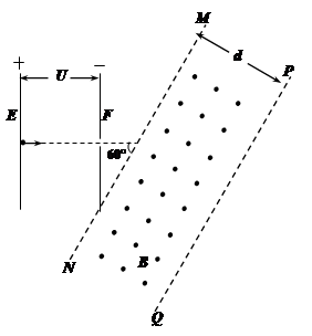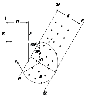 1、计算题 如图所示,两平行金属板E、F之间电压为U,两足够长的平行边界MN、PQ区域内,有垂直纸面向外的匀强磁场,磁感应强度为B.一质量为m、带电量为+q的粒子(不计重力),由E板中央处静止释放,经F板上的小孔射出后,垂直进入磁场,且进入磁场时与边界MN成60°角,最终粒子从边界MN离开磁场.求: