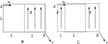 4、简答题 18.(14分)如图所示,在长为2L、宽为L的区域内有正好一半空间有场强为E、方向平行于短边的匀强电场,有一个质量为m,电量为e的电子,以平行于长边的速度v0从区域的左上角A点射入该区域,不计电子所受重力,要使这个电子能从区域的右下角的B点射出,求: