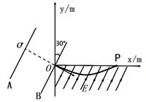 1、计算题  如图所示,两带电平行金属板A、B与竖直方向成30°角放置,两板间电势差 =500V。B板中心有一小孔正好位于平面直角坐标系 xOy上的O点,y轴沿竖直方向。一比荷为1.0×105C/kg的带正电粒子P,从A板中心