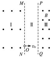 4、计算题 如图所示,相互平行的竖直分界面MN、PQ,相距L,将空间分为Ⅰ、Ⅱ、Ⅲ区.Ⅰ、Ⅲ区有水平方向的匀强磁场,Ⅰ区的磁感应强度未知,Ⅲ区的磁感应强度为B;Ⅱ区有竖直方向的匀强电场(图中未画出).一个质量为m、电荷量为e的电子,自MN上的O点以初速度v0水平射入Ⅱ区,此时Ⅱ区的电场方向竖直向下,以后每当电子刚从Ⅲ区进入Ⅱ区或从Ⅰ区进入Ⅱ区时,电场突然反向,场强大小不变,这个电子总是经过O点且水平进入Ⅱ区.(不计电子重力)