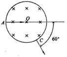 5、计算题  如图所示,半径为r的圆形区域内存在着垂直纸面向里的匀强磁场,磁感应强度为B。现有一带电离子(不计重力)从A以速度v沿圆形区域的直径射入磁场,已知离子从C点射出磁场的方向间的夹角为60°。
