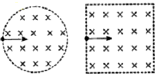 3、选择题  如图所示,两个横截面分别为圆形和正方形的区域内有磁感应强度相同的匀强磁场,圆的直径和正方形的边长相等,两个电子分别以相同的速度分别飞入两个磁场区域,速度方向均与磁场方向垂直,进入圆形磁场的电子初速度方向对准圆心;进入正方形磁场的电子初速度方向垂直于边界,从中点进入。则下面判断正确的是
