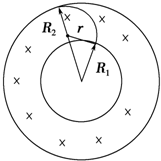 1、简答题 如图所示是一种简化磁约束示意图,可以将高能粒子约束起来.有一个环形匀强磁场区域的截面内半径R1,外半径R2,被约束的粒子带正电,比荷
