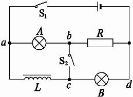 5、选择题 图2所示,A和B是电阻为R的电灯,L是自感系数较大的线圈,当S1闭合、S2断开且电路稳定时,A、B亮度相同,再闭合S2,待电路稳定后将S1断开.下列说法中,正确的是( )