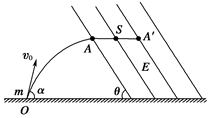 1、计算题 一质量为m、电荷量为+q的小球,从O点以和水平方向成α角的初速度v0抛出,当达到最高点A时,恰进入一匀强电场中,如图.经过一段时间后,小球从A点沿水平直线运动到与A相距为S的A′点后又折返回到A点,紧接着沿原来斜上抛运动的轨迹逆方向运动又落回原抛出点.求