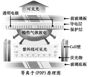 3、选择题 如图所示,用来制造大屏幕壁挂式彩色电视机的等离子显示屏是一种以等离子管作为发光元件,并由大量的等离子管排列在一起构成的屏幕,每个等离子管的透明玻璃管内部都充有低压的氖氙气体,管的两端各有一个电极,在两个电极间加上高电压,封在管内的气体产生肉眼看不见的紫外线后激发平板显示屏上红、绿、蓝三基色荧光粉发出可见光,则下列说法中正确的是( ).
