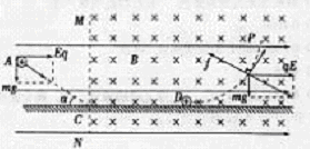 4、计算题 如图所示,空间内存在水平向右的匀强电场,在虚线MN的右侧有垂直纸面向里、磁感应强度为B的水平匀强磁场,一质量为m、带电荷量为+q的小颗粒自A点由静止开始运动,刚好沿直线运动至光滑绝缘的水平面C点,与水平面碰撞后小颗粒的竖直分速度立即减为零,而水平分速度不变,小颗粒运动至D处刚好离开水平面,然后沿图示曲线DP轨迹运动,AC与水平面夹角α=37°,sin37°=0.6,cos37°=0.8,重力加速度为g,求: