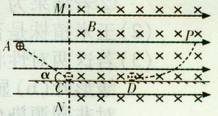 4、计算题 如图所示,空间内存在水平向右的匀强电场,在虚线MN的右侧有垂直纸面向里、磁感应强度为B的水平匀强磁场,一质量为m、带电荷量为+q的小颗粒自A点由静止开始运动,刚好沿直线运动至光滑绝缘的水平面C点,与水平面碰撞后小颗粒的竖直分速度立即减为零,而水平分速度不变,小颗粒运动至D处刚好离开水平面,然后沿图示曲线DP轨迹运动,AC与水平面夹角α=37°,sin37°=0.6,cos37°=0.8,重力加速度为g,求: