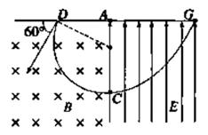 1、计算题 如右图所示,一个质量为m、电荷量为q的正离子,从D处沿图示方向以一定的速度射入磁感应强度为B的匀强磁场中,磁场方向垂直纸面向里.结果离子正好从距A点为d的小孔C沿垂直于电场方向进入匀强电场,此电场方向与AC平行且向上,最后离子打在距离A点2d的G处, AG⊥AC.若不计离子重力,离子运动轨迹始终在纸面内,试求: