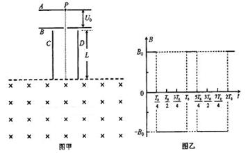 5、计算题 (22分)某放置在真空中的装置如图甲所示,水平放置的平行金属板A、B中间开有小孔,小孔的连线与竖直放置的平行金属板C、D的中心线重合。在C、D的下方有如图所示的、范围足够大的匀强磁场,磁场的理想上边界与金属板C、D下端重合,其磁感应强度随时间变化的图象如图乙所示,图乙中的为已知,但其变化周期
