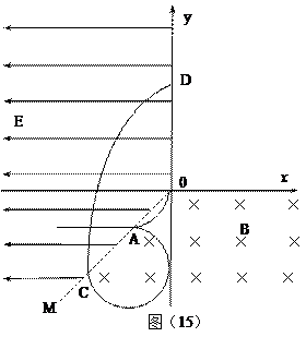 1、简答题 在xoy平面内,第Ⅲ象限内的直线OM是电场与磁场的边界,OM与负x轴成45°角。在x<0且OM的左侧空间存在着负x方向的匀强电场E,场强大小为32N/C,在y<0且OM的右侧空间存在着垂直纸面向里的匀强磁场B,磁感应强度大小为0.1T,如图(13)所示。一不计重力的带负电的微粒,从坐标原点O沿y轴负方向以υ0=2×103m/s的初速度进入磁场,已知微粒的带电量为q=5×10-18C,质量为m=1×10-24kg,(不计微粒所受重力),求: