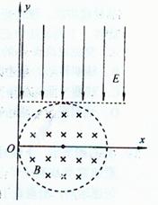 2、计算题 如图所示,在x-o-y坐标系中,以(r,0)为圆心,r为半径的圆形区域内存在匀强磁场,磁场的磁感应强度大小为B,方向垂直于纸面向里。在y>r的足够大的区域内 ,存在沿y轴负方向的匀强电场,场强大小为E。从O点以相同速率向不同方向发射质子,质子的运动轨迹均在纸面内,且质子在磁场中运动的轨迹半径也为r。已知质子的电荷量为q,质量为m,不计质子所受重与及质子间相互作用力的影响。
