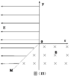 1、简答题 在xoy平面内,第Ⅲ象限内的直线OM是电场与磁场的边界,OM与负x轴成45°角。在x<0且OM的左侧空间存在着负x方向的匀强电场E,场强大小为32N/C,在y<0且OM的右侧空间存在着垂直纸面向里的匀强磁场B,磁感应强度大小为0.1T,如图(13)所示。一不计重力的带负电的微粒,从坐标原点O沿y轴负方向以υ0=2×103m/s的初速度进入磁场,已知微粒的带电量为q=5×10-18C,质量为m=1×10-24kg,(不计微粒所受重力),求: