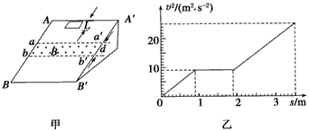 5、计算题  如图甲所示,一个质量m=0.1 kg的正方形金属框总电阻R=0.5 Ω,金属框放在表面绝缘且光滑的斜面顶端(金属框上边与AA′重合),自静止开始沿斜面下滑,下滑过程中穿过一段边界与斜面底边BB′平行、宽度为d的匀强磁场后滑至斜面底端(金属框下边与BB′重合),设金属框在下滑过程中的速度为v,与此对应的位移为s,那么v2-s图象(记录了线框运动全部过程)如图乙所示,已知匀强磁场方向垂直斜面向上。试问:(g取10m/s2)