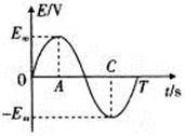 3、选择题  一个单匝的线圈,面积为S,在匀强磁场中绕垂直磁感线的轴匀速转动,产生的感应电动势随时间变化的规律如图所示,下列判断正确的是(?)