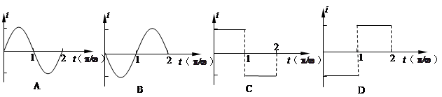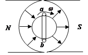 1、选择题 如图所示,一圆柱形铁芯上沿轴线方向绕有矩形线圈,铁芯与磁极的缝隙间形成了辐向均匀磁场,磁场的中心与铁芯的轴线重合.当铁芯绕轴线以角速度ω沿顺时针方向匀速转动时,下列线圈中电流随时间变化的图象,正确的是(从图位置开始计时,NS极间缝隙的宽度不计,以a边的电流进入纸面,b边的电流出纸面为正方向)(?)