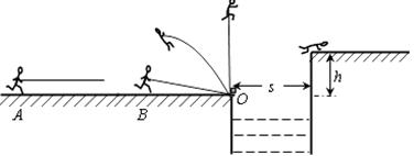 3、计算题 如图所示,一位质量m =60kg参加“挑战极限”的业余选手,要越过一宽度为s=2.5m的水沟,跃上高为h=2.0m的平台,采用的方法是:人手握一根长L=3.25m的轻质弹性杆一端,从A点由静止开始匀加速助跑,至B点时,杆另一端抵在O点的阻挡物上,接着杆发生形变、同时脚蹬地,人被弹起,到达最高点时杆处于竖直,人的重心在杆的顶端,此刻人放开杆水平飞出,最终趴落到平台上,运动过程中空气阻力可忽略不计.