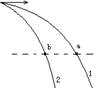 4、选择题 小球两次从同一位置水平抛出,运动轨迹如图所示。轨迹上a、b两点在同一水平线上。设小球从抛出到运动到a、b两点运动的时间分别为t1、t2,则?