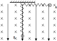 2、选择题 如图所示,在纸面内存在着正交的电磁场,电场竖直向下,磁场垂直纸面向里.一轻质弹簧的一端固定在天花板上的O点,并且可以绕O点无摩擦的自由转动,另一端栓接一带正电的小球,初始时刻,把小球拉到A点,此时弹簧处于原长,然后静止释放,经过一段时间小球第一次运动到竖直位置的B点.则在小球第一次由A运动到B的过程中下列说法错误的是( )