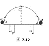 4、简答题 如图2-12所示,一轻绳两端各系一小球(可视为质点),质量分别为M和m(M>m),跨放在一个光滑的半圆柱体上.两球从水平直径AB的两端由静止释放开始运动.当m刚好达到圆柱体侧面最高点C处时,恰脱离圆柱体.则两球质量之比M∶m=?