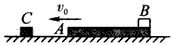 4、计算题 如图所示,长木板A上右端有一物块B,它们一起在光滑的水平面上向左做匀速运动,速度v0=2.0 m/s。A左侧有一个与A等高的固定物体C。已知A的质量为mA=1.0 kg,物块B的质量为mB=3.0 kg,B与A间的动摩擦因数μ=0.5,取g=10 m/s2。求: