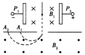 1、计算题 如图所示,坐标系中第一象限有垂直纸面向外的匀强磁场,磁感应强度B=102 T,同时有竖直向上与y轴同方向的匀强电场,场强大小E1=102 V/m,第四象限有竖直向上与y轴同方向的匀强电场,场强大小E2=2E1=2×102 V/m.若有一个带正电的微粒,质量m=10-12 kg,电量q=10-13 C,以水平与x轴同方向的初速度从坐标轴的P1点射入第四象限,OP1="0.2" m,然后从x轴上的P2点穿入第一象限,OP2="0.4" m,接着继续运动.取g=10? m/s2.求: