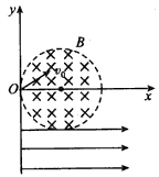5、计算题 如图所示,真空中有一以(r,0)为圆心,半径为r的圆柱形匀强磁场区域,磁场的磁感应强度大小为B,方向垂直于纸面向里,在y≤一r的范围内,有方向水平向右的匀强电场,电场强度的大小为E。从O点向不同方向发射速率相同的电子,电子的运动轨迹均在纸面内。已知电子的电量为e,质量为m,电子在磁场中的偏转半径也为r,不计重力及阻力的作用,求: