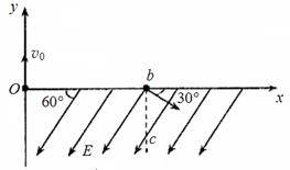 5、计算题 (21分)如图所示,x轴上方存在磁感应强度为B的圆形匀强磁场区域,磁场方向垂直纸面向外(图中未画出)。x轴下方存在匀强电场,场强大小为E,方向沿与x轴负方向成60°角斜向下。一个质量为m,带电量为+e的质子以速度v0从O点沿y轴正方向射入匀强磁场区域。质子飞出磁场区域后,从b点处穿过x轴进入匀强电场中,速度方向与x轴正方向成30°,之后通过了b点正下方的c点。不计质子的重力。