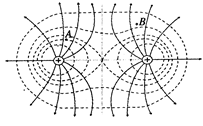 2、选择题  一对等量正点电荷电场的电场线(实线)和等势线(虚线)如图所示,图中A、B两点电场强度分别是EA、EB,电势分别是ΦA、ΦB,负电荷q在A、B时的电势能分别是EPA、EPB,下列判断正确的是