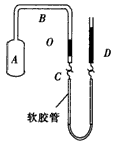 5、计算题 气体温度计结构如图所示。玻璃测温泡A内充有理想气体,通过细玻璃管B和水银压强计相连。开始时A处于冰水混合物中,左管C中水银面在O点处,右管D中水银面高出O点h1=14 cm,后将A放入待测恒温槽中,上下移动D,使C中水银面仍在O点处,测得D中水银面高出O点h2=44 cm(已知外界大气压为1个标准大气压,1标准大气压相当于76 cmHg)。