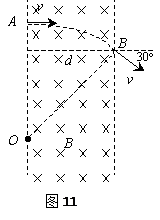 2、填空题 如图11所示,一束电子(电量为e)以速度v垂直射入磁感强度为B,宽度为d的匀强磁场中,穿透磁场时速度方向与电子原来入射方向的夹角是30°,则电子的质量是 ,穿透磁场的时间是 。
