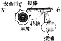 1、选择题 如图所示是一种汽车安全带控制装置示意图.当汽车处于静止或匀速直线运动时,刹车摆锤竖直悬挂,锁棒水平,棘轮可以自由转动,安全带能被拉动.当汽车突然刹车时,摆锤由于惯性绕轴摆动,使得锁棒锁定棘轮的转动,安全带不能被拉动.若摆锤从图中实线位置摆到虚线位置,汽车的可能运动方向和运动状态( )